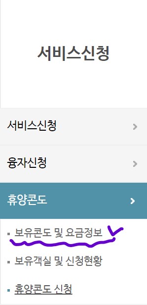 오른 쪽 메뉴의 [보유 콘도 및 요금 정보]메뉴를 클릭합니다.